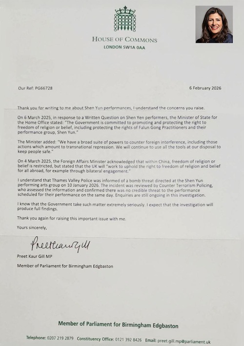 Preet Kaur Gill, poslankyně za Birmingham Edgbaston, napsala: „Dne 6. března 2025 v odpovědi na písemný dotaz týkající se účinkujících Shen Yun uvedl státní ministr ministerstva vnitra: ‚Vláda je odhodlána podporovat a chránit právo na svobodu náboženského vyznání či přesvědčení, včetně ochrany práv praktikujících Falun Gongu a jejich umělecké skupiny Shen Yun.‘
